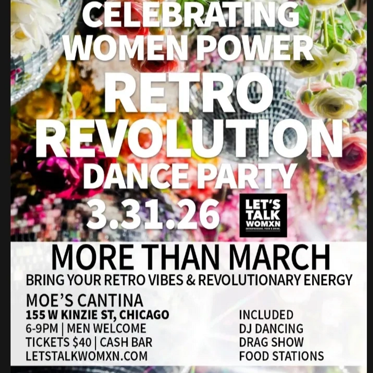 Join Let’s Talk Womxn on March 31 from 6–9 PM at Moe’s Cantina River North as we close Women’s History Month with our Retro Revolution Dance Party. Spend the evening in an unabashed celebration of women empowering women. By 150 of Chicago’s Let’s Talk Womxn leading food and beverage entrepreneurs, this celebration is for all Chicago. Men are more than welcome. With awards for the most retro vibe looks! Tickets include incredible tastings by our LTW member food stations, DJ, dancing, drag performances and more. A cash bar of unique cocktails by Let’s Talk Womxn beverage makers is offered. Bring your retro vibes and revolutionary energy!